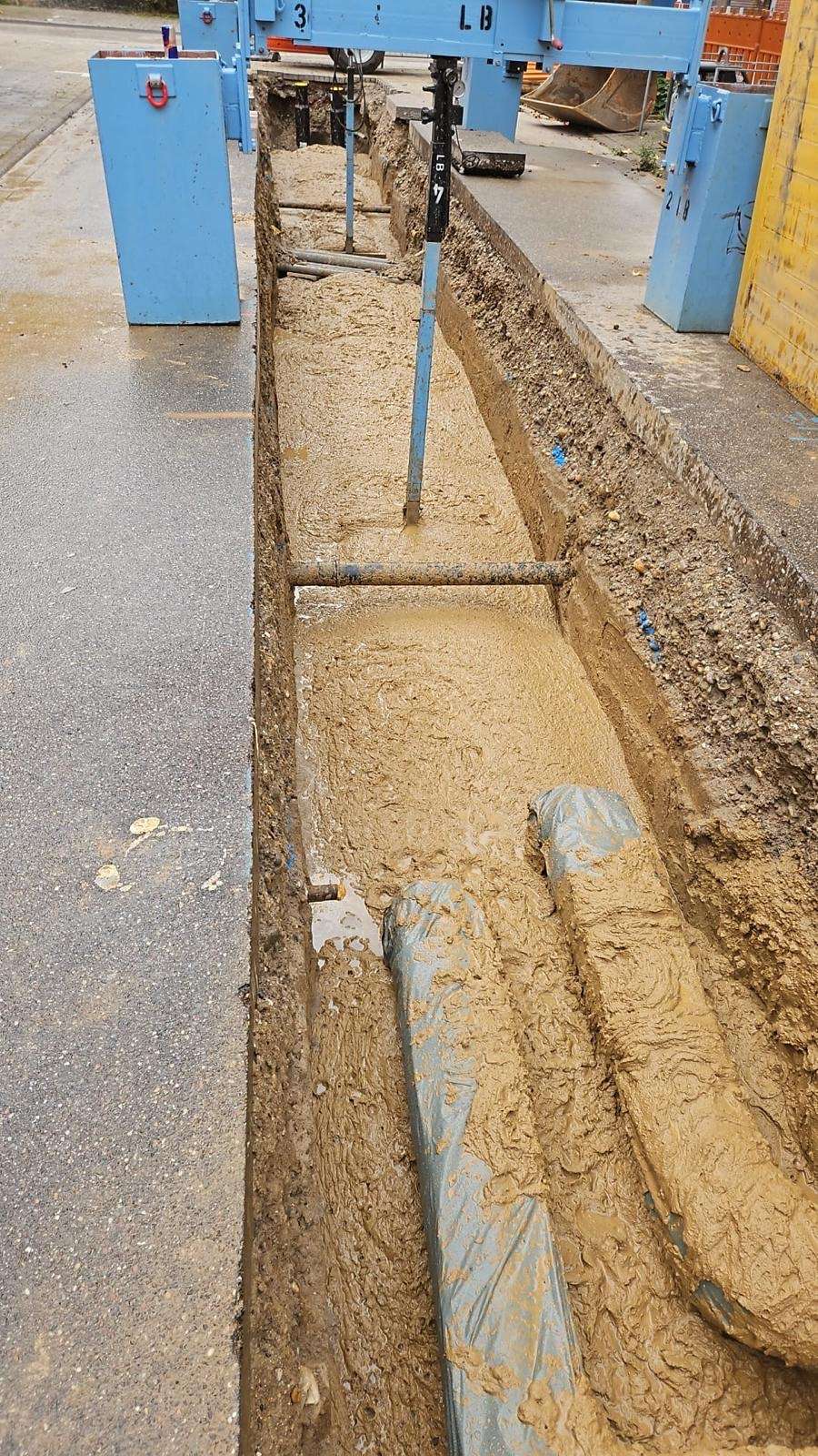 - Verwendung des Flüssigbodens als tragfähiges, setzungsarmes und dauerhaft wirksames Bettungs- und Ummantelungsmaterial für die Fernwärmerohre.
